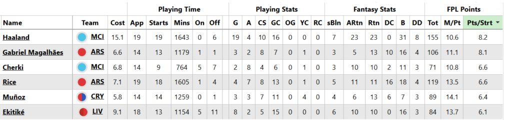 Gabriel’s points-per-start average is right up there with Erling Haaland‘s (£15.1m):