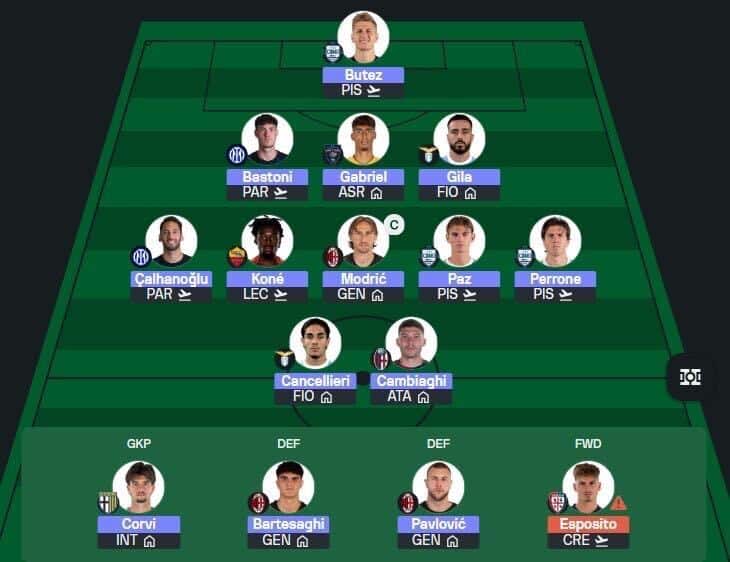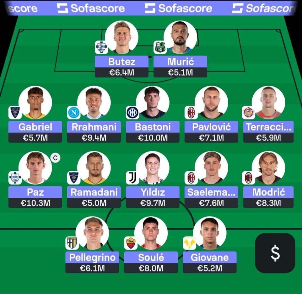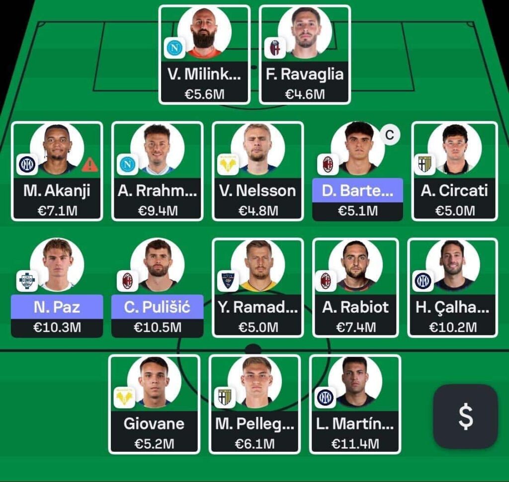 - AC Milan and Inter assets form the backbone of the team. Both sides look essential for the upcoming doubles, even if budget constraints mean I’ve had to settle for just two Inter players rather than three. I’ve also doubled up on Como, who continue to outperform expectations and offer strong value. Cheap enablers from Lecce and Parma help balance the squad without sacrificing too much upside.