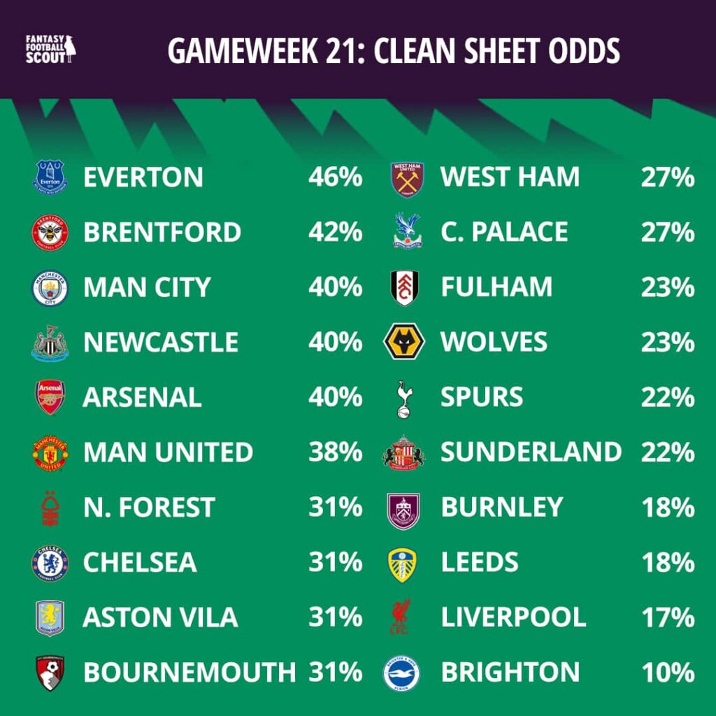 GAMEWEEK 21 CLEAN SHEET ODDS
