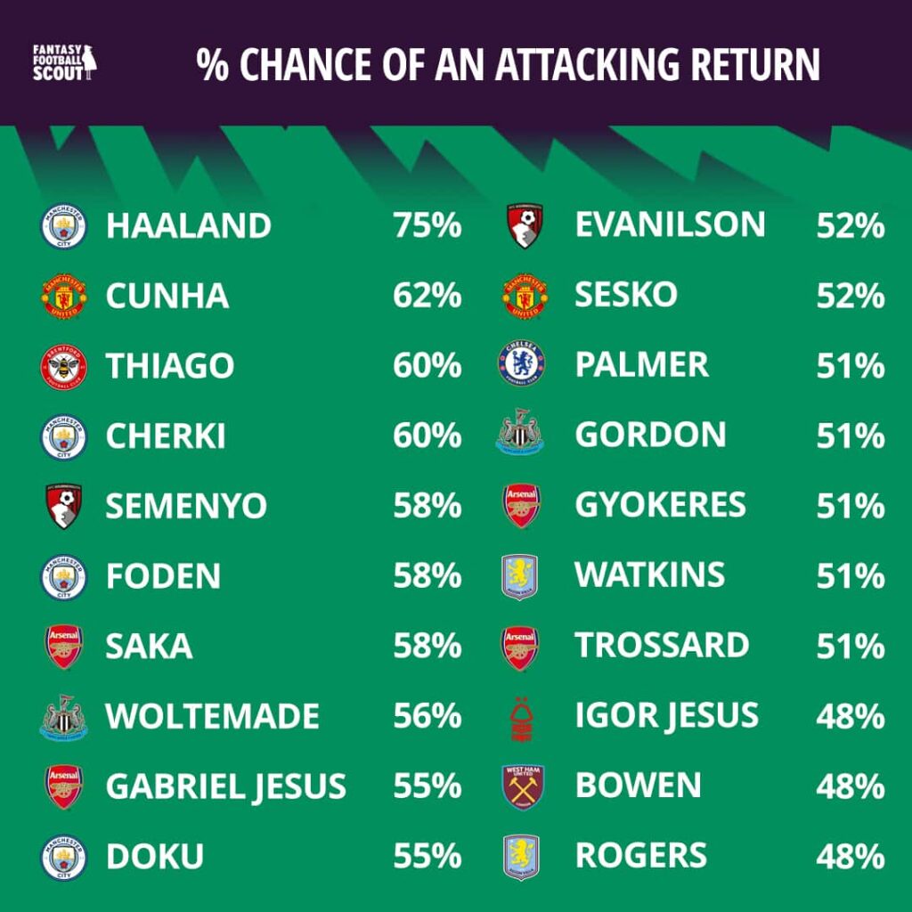 A trio of popular picks sit just behind on a 58% chance of delivering an attacking return. Phil Foden (£8.9m) features despite blanking in his last four matches, while Bournemouth’s Antoine Semenyo (£7.6m) remains a key attacking outlet and continues to attract attention amid speculation over a potential move to Manchester City. Bukayo Saka (£10.2m) rounds off the group, with Arsenal hosting a Liverpool side that has struggled defensively.