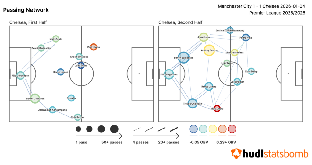 Above: Chelsea’s first (left) and second-half (right) passing networks v Man City