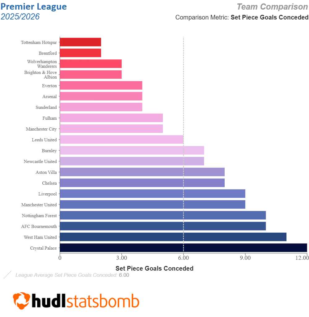 Crystal Palace are now bottom for set-piece goals conceded in 2025/26.