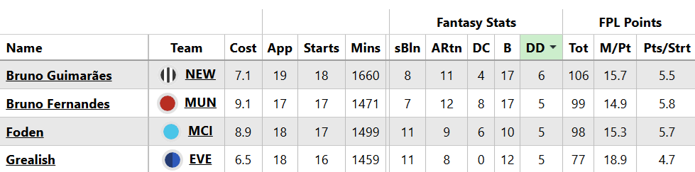 Back-to-back goals for Bruno Guimaraes (£7.1m) means the Brazilian has now got more double-digit hauls (DD, below) to his name than any other Fantasy midfielder this season.