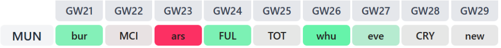 The Red Devils face the top two in Gameweeks 22 and 23, although the derby being held at home (and Old Trafford potentially buoyed by a new appointment) could make life tricky for Pep Guardiola’s troops.