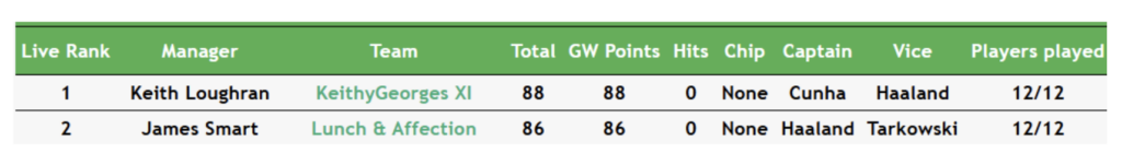 The LMS leaderboard shows the highest scores after the deduction of hit points, and also the teams that were in the danger zone. Keith Loughran was the highest scorer of the Gameweek thanks to double-digit hauls from Declan Rice, Igor Thiago and Malich Thiaw together with a near-haul from captain Matheus Cunha.