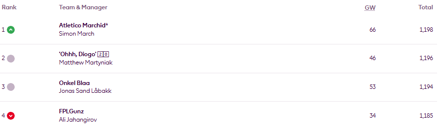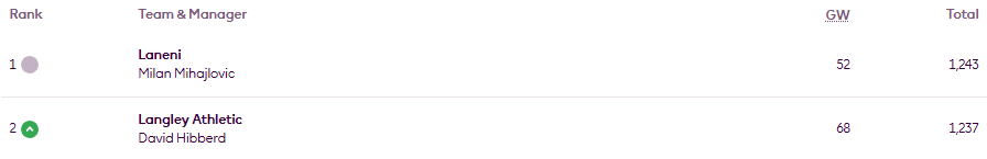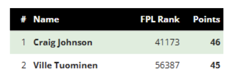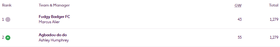 Marcus Alier (Fudgy Badger) leads my Multiple Top 10k Finishes mini-league (league code tm6cxk) for a fourth week and is now 3,086th overall. Ashley Humphrey is level with him on points but has made more transfers.