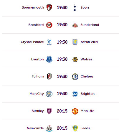A whopping eight Premier League fixtures to come this evening, with six kicking off at 19:30 GMT and another two underway 45 minutes later: