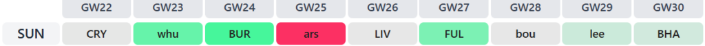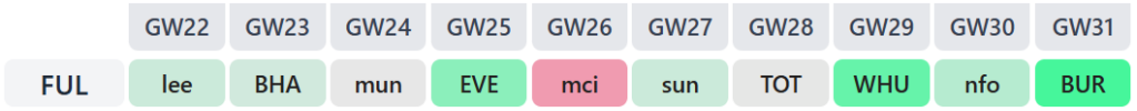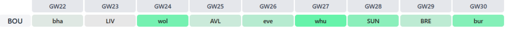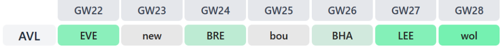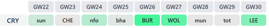 Matches against Crystal Palace, West Ham and Burnley provide three favourable chances over the next three Gameweeks. There are decent matches beyond the unappealing Gameweek 25/26 double-header, too: