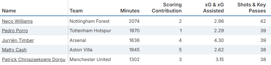 He ranks among the top eight defenders for total DefCons in 2025/26, while his long throws and occasional run-outs at right-back offer the prospect of sporadic attacking returns, too.