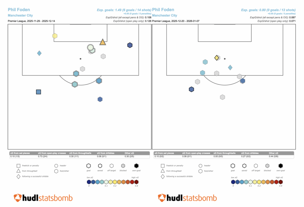Above: Phil Foden’s shot map in Gameweeks 13-16 (left) and Gameweeks 17-21 (right)