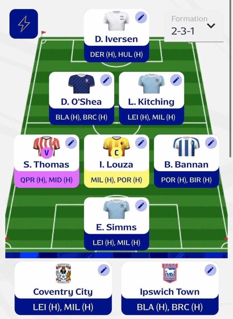 - For the team picks, Ipswich Town felt like an obvious choice given their schedule this week. I’ve paired them with Coventry City, who look well placed to get back to winning ways.