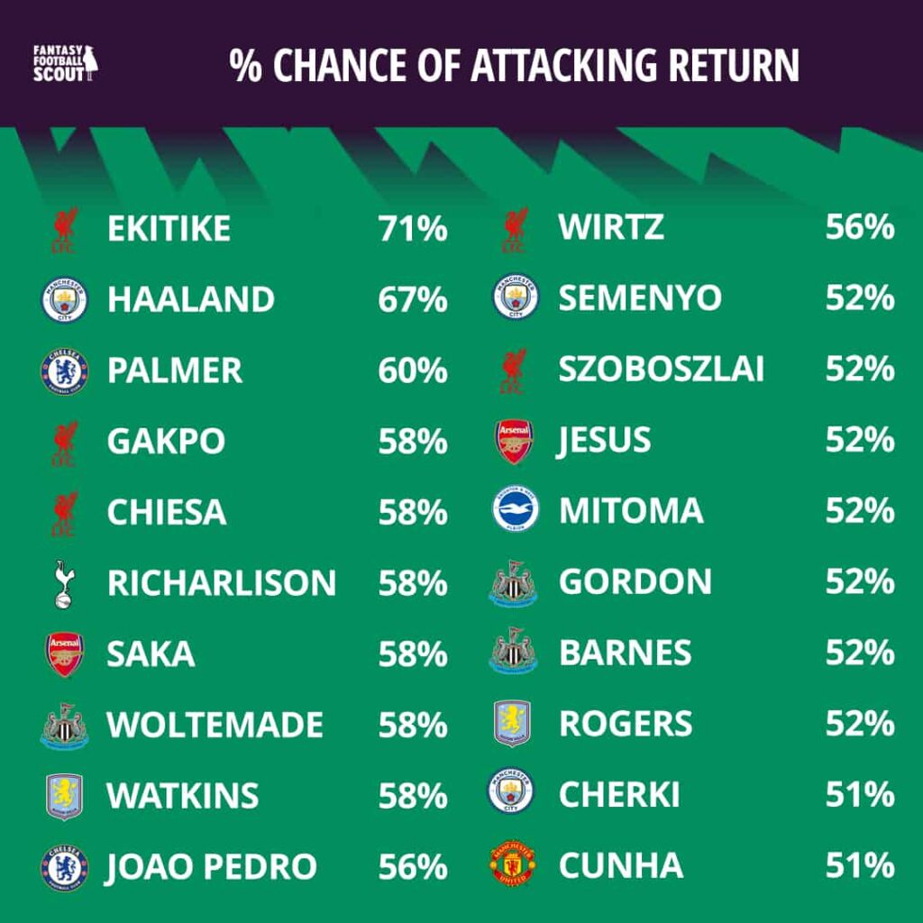 Elsewhere, six players join Gakpo and Chiesa with a 58% probability of returning. Arsenal star Bukayo Saka (£10.2m) faces a porous Nottingham Forest backline, while Newcastle United’s Nick Woltemade (£7.3m) and Ollie Watkins (£8.7m) also rate well and should both see opportunities to deliver. Tottenham Hotspur forward Richarlison (£6.4m) may now be injured, however.