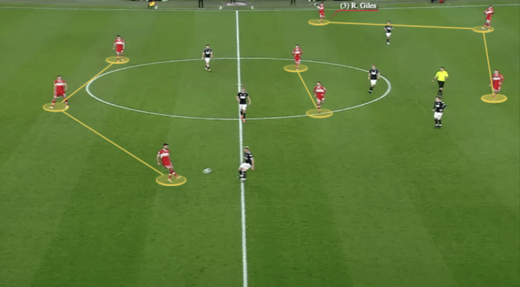 Meanwhile, the right-back would tuck in to form a back three, with the in-possession shape captured below via The Athletic, including left-back Ryan Giles (3) pushed high up the left flank.
