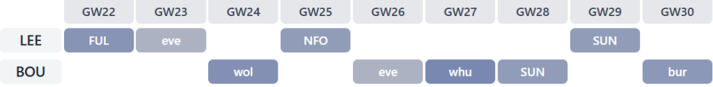 Leeds, though, have a kinder-looking clash in Gameweek 23, after an arguably better Gameweek 22 match as well, before offering decent alternatives to the Bournemouth bunch in the likes of Gameweek 25 and 29.