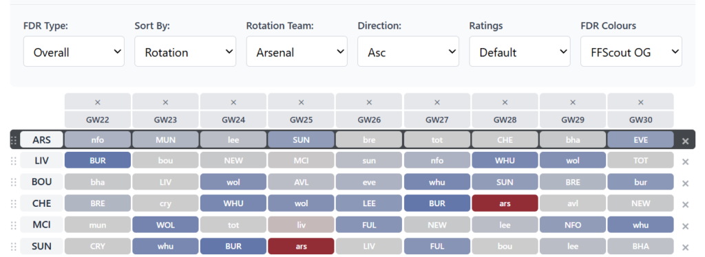 We’re using our customisable Fixture Ticker for this article, a tool that lets you filter clubs by rotation as well as other sortable options like fixture difficulty.