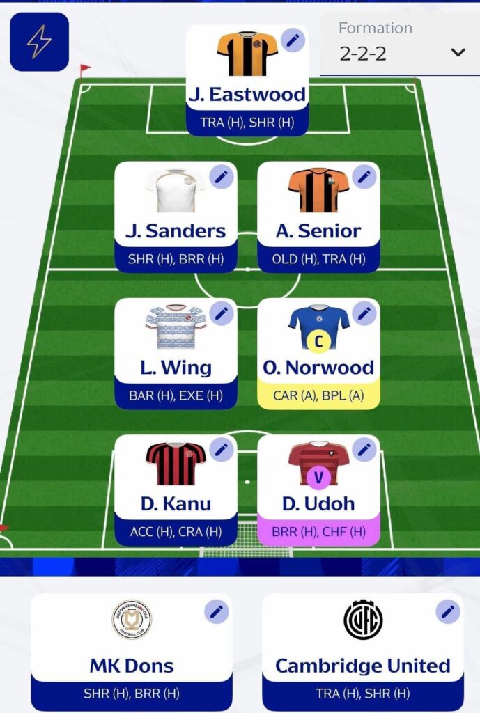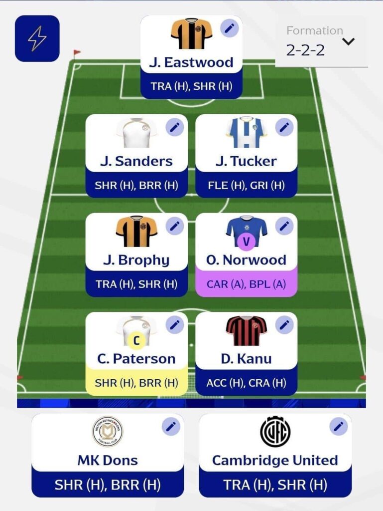 - I’m also backing Cambridge United and MK Dons. The only thing I might change is Sowunmi to Lincoln City’s Sonny Bradley; otherwise, everything should stay the same.