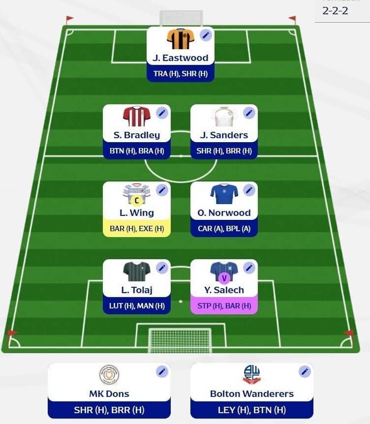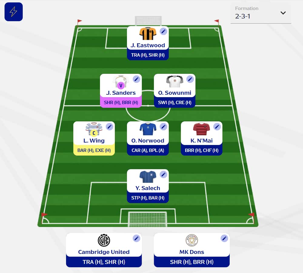 - Midfield was easy. Lewis Wing is arguably an easy captaincy choice, whilst Oliver Norwood has frustrated, but still offers more than most other midfielders in the game. I always try to pick one differential and the in-form Kelly N’Mai of Salford City will be that for me.