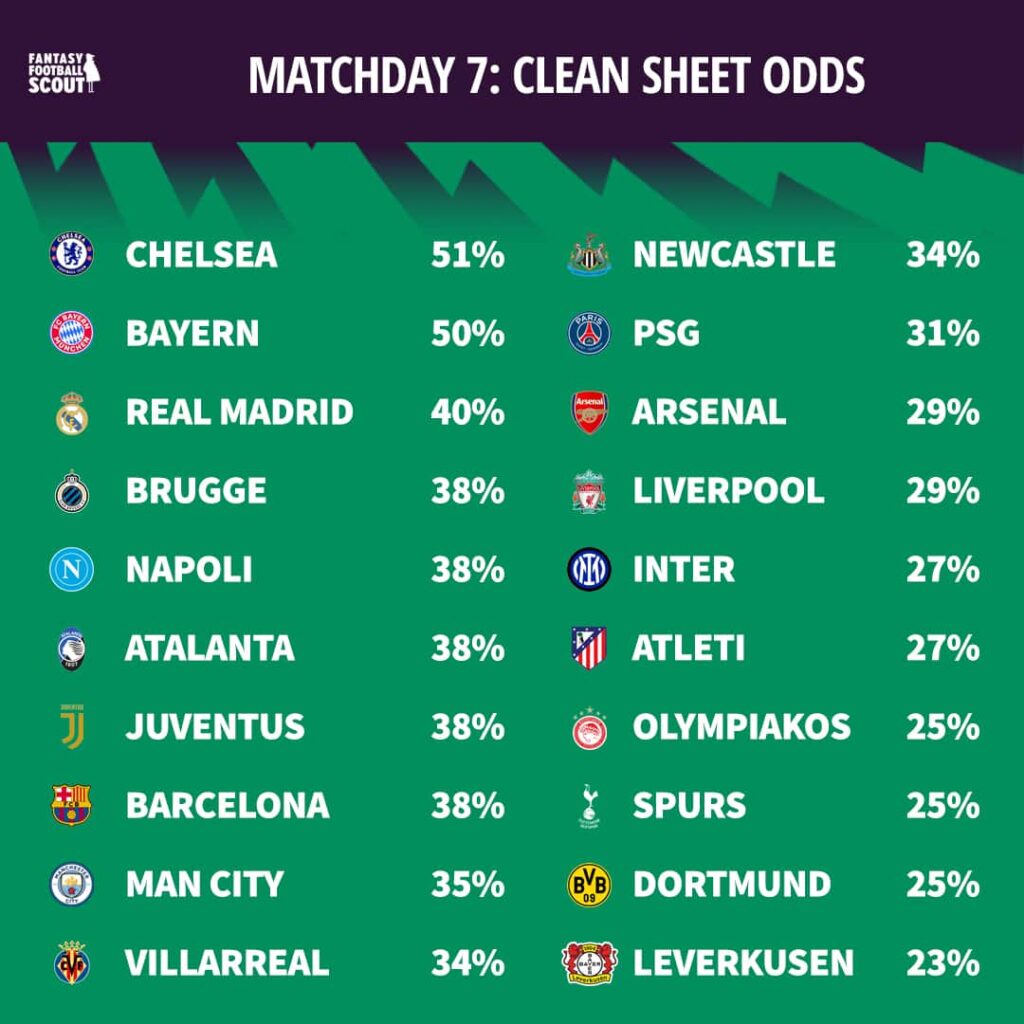 Chelsea lead the way for clean-sheet potential in Matchday 7. The Blues top the odds despite managing just one shut-out across their previous six matches in all competitions. That record could improve against Pafos, who have failed to score in any of their away Champions League fixtures so far.