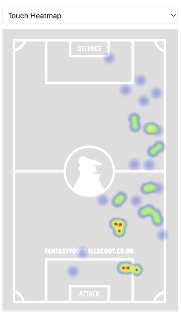 Above: Patrick Dorgu’s touch heatmap against Arsenal in Gameweek 23