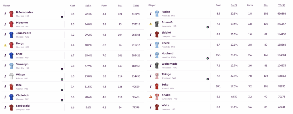 Based on fixtures, form and injuries, these players are being transferred in (TI(R), below) and out (TO(R), below) the most.