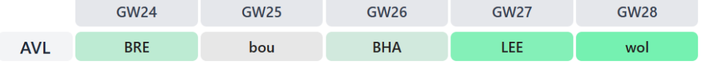 Three of the next four matches are at Villa Park, while there’s also a trip to rock-bottom Wolves to come in the next five Gameweeks:
