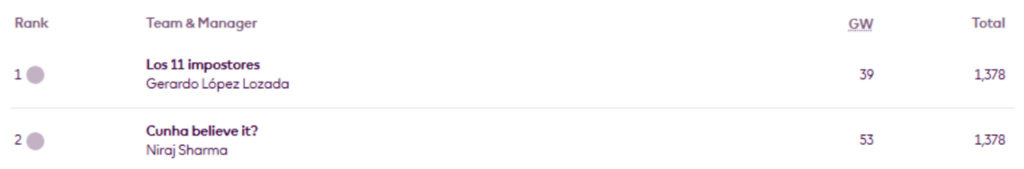 Gerardo López Lozada stays in control of the FFScout Family mini-league for a 12th week. Level on points is Niraj Sharma, but this team has made more transfers.