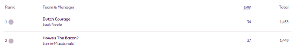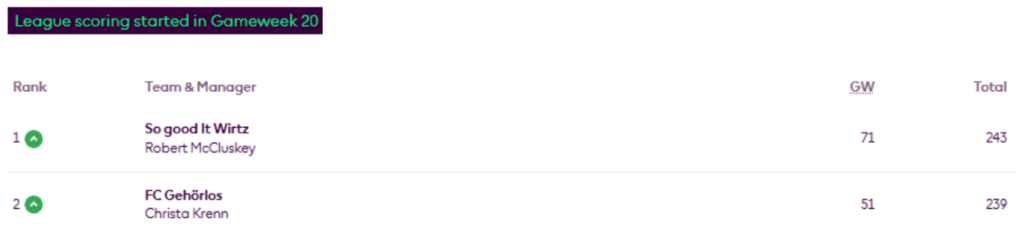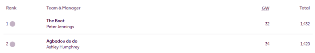 The tables in MIR’s FFS Head-to-Head Leagues still show the positions and scores after Gameweek 21, rather than the latest round. All except the Fixtures and Results table, which shows the fixtures for the latest Gameweek 23. It may be a few weeks before the head-to-head tables are fully updated.