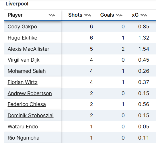 His on-target header, following Ekitike’s flick-on from Szoboszlai’s corner, was helped over the line by Mac Allister to open the scoring. That was one of four shots – joint with Wirtz and Salah – taken by the Reds’ skipper.