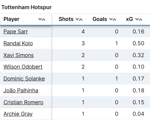 | Tottenham Hotspur | 5 | Vicario (90), Danso (90), Romero (90), Spence (90), Simons (90), Odobert (73) | Palhinha (90), Udogie (89), P.Sarr (90), Gray (90), Kolo Muani (84), Solanke (17), Scarlett (6), Byfield (1) |