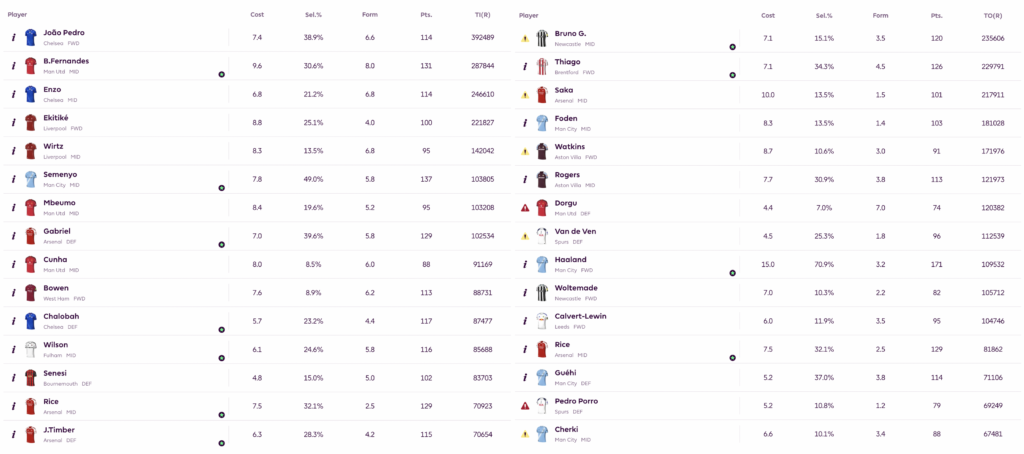 Based on fixtures, form and injuries, these players are being transferred in (TI(R), below) and out (TO(R), below) the most.