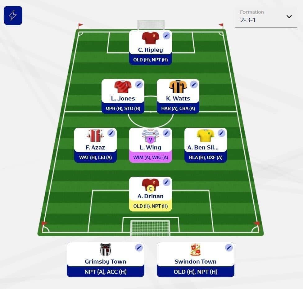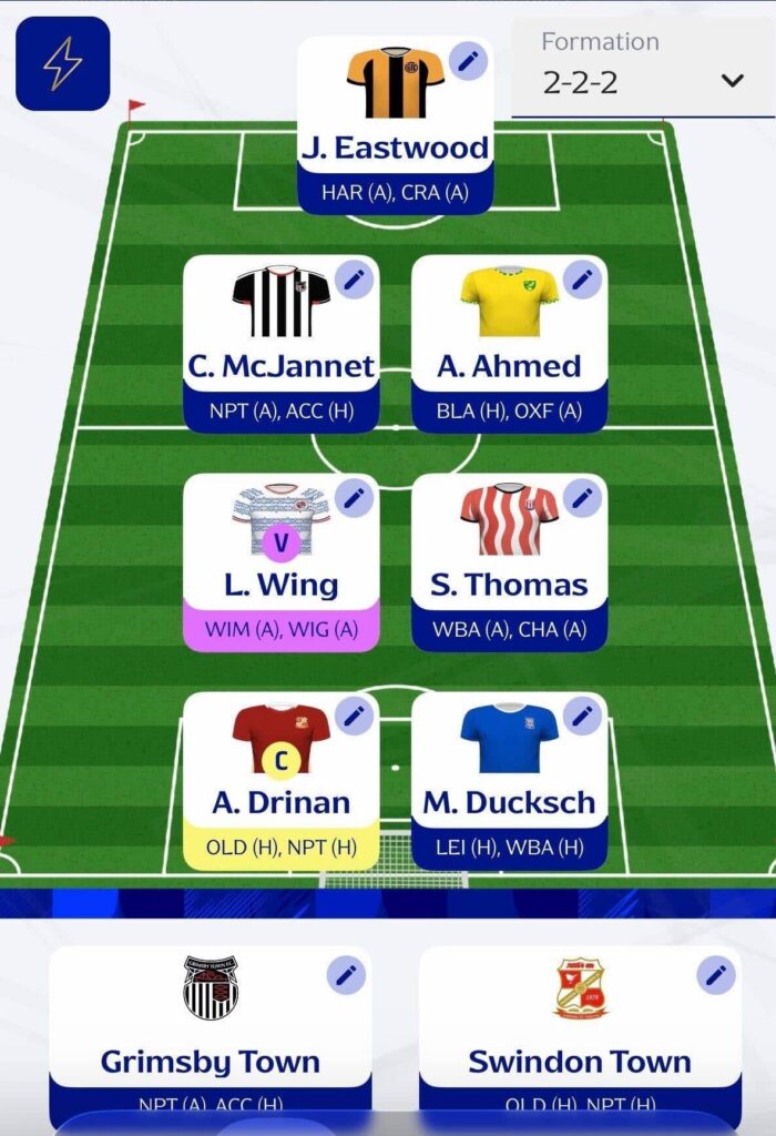 - For team selections, I’ve gone with Swindon Town and Grimsby Town. Both sides arrive in strong form, boast favourable fixtures, and continue to push for promotion.