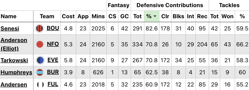 Two defensive contribution (DefCon) magnets, James Tarkowski (£5.8m) and Joachim Andersen (£4.6m), face off against each other at Craven Cottage on Saturday. They rank third and fifth respectively for DefCon success rate (%) in 2025/26: