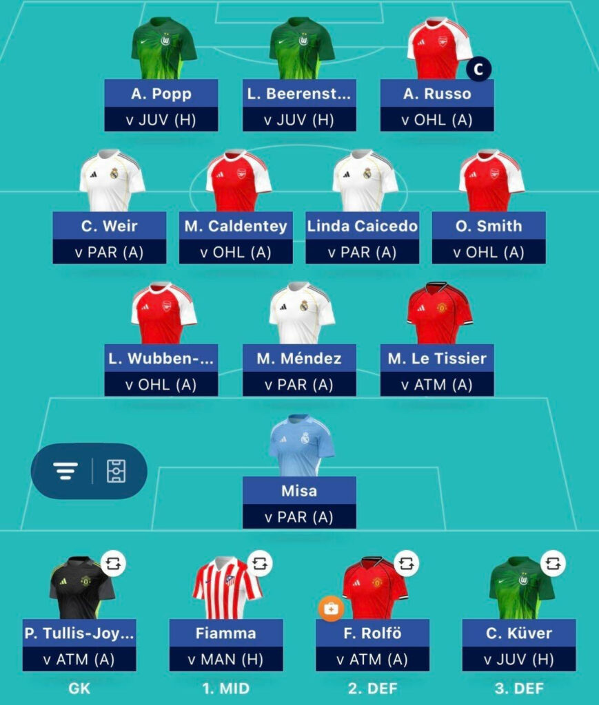 Manchester United’s Phallon Tullis-Joyce (5.4m) sits as my back-up for Thursday. The American kept three clean sheets during the league phase, including a 1–0 win away to Atlético Madrid, who they face again this week. Stina Johannes (4.9m) of Wolfsburg remains under consideration, but for now Tullis-Joyce holds the edge.
