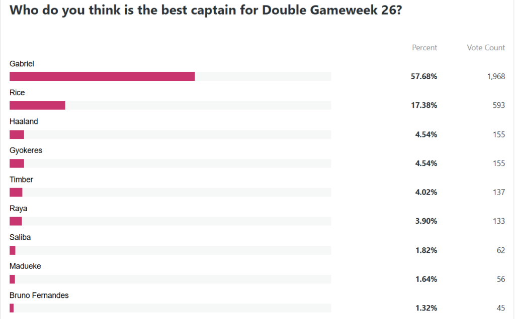 Perhaps unsurprisingly, given he’s also under Triple Captain consideration for some managers this week, Gabriel leads the way in our Double Gameweek 26 captaincy poll, with a whopping 57% of the vote at the time of writing.