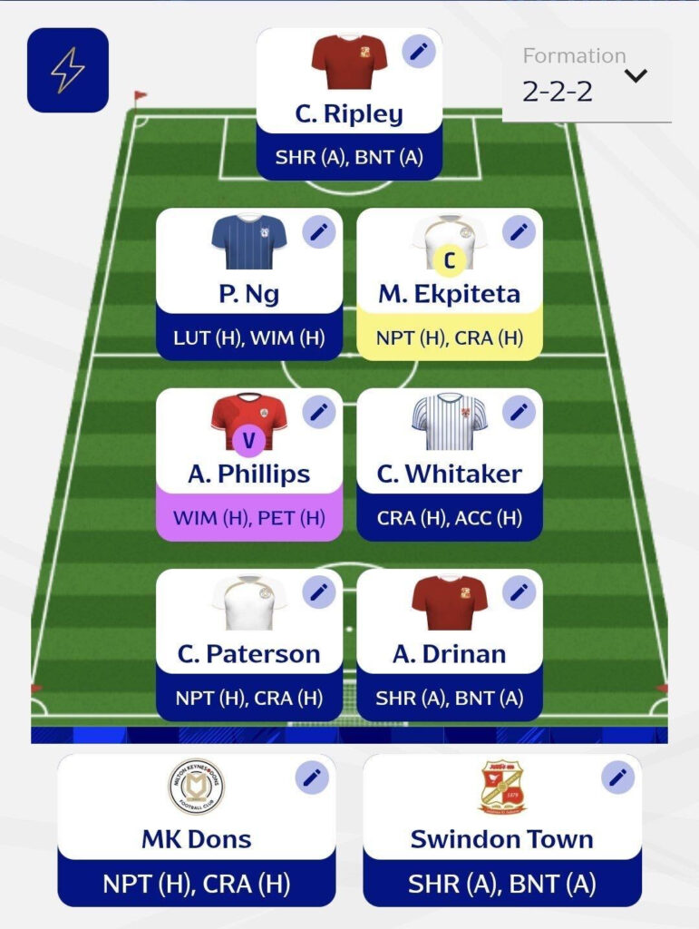 - Team Picks: Overall, I’m prioritising teams with proven attacking strength. MK Dons, in particular, have excellent fixtures and the quality to secure wins in both matches. Swindon Town, on the other hand, face a slightly tougher challenge with two away fixtures; however, that only enhances the value of the away win bonus should they deliver.