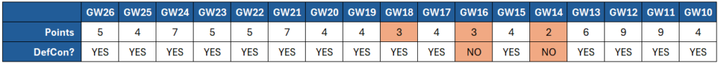 Nobody in the league has reached the threshold more often, and he’s done so in 10 consecutive matches. This means he’s pretty much got a weekly floor of four points because, unlike defenders, he won’t lose points based on goals conceded.