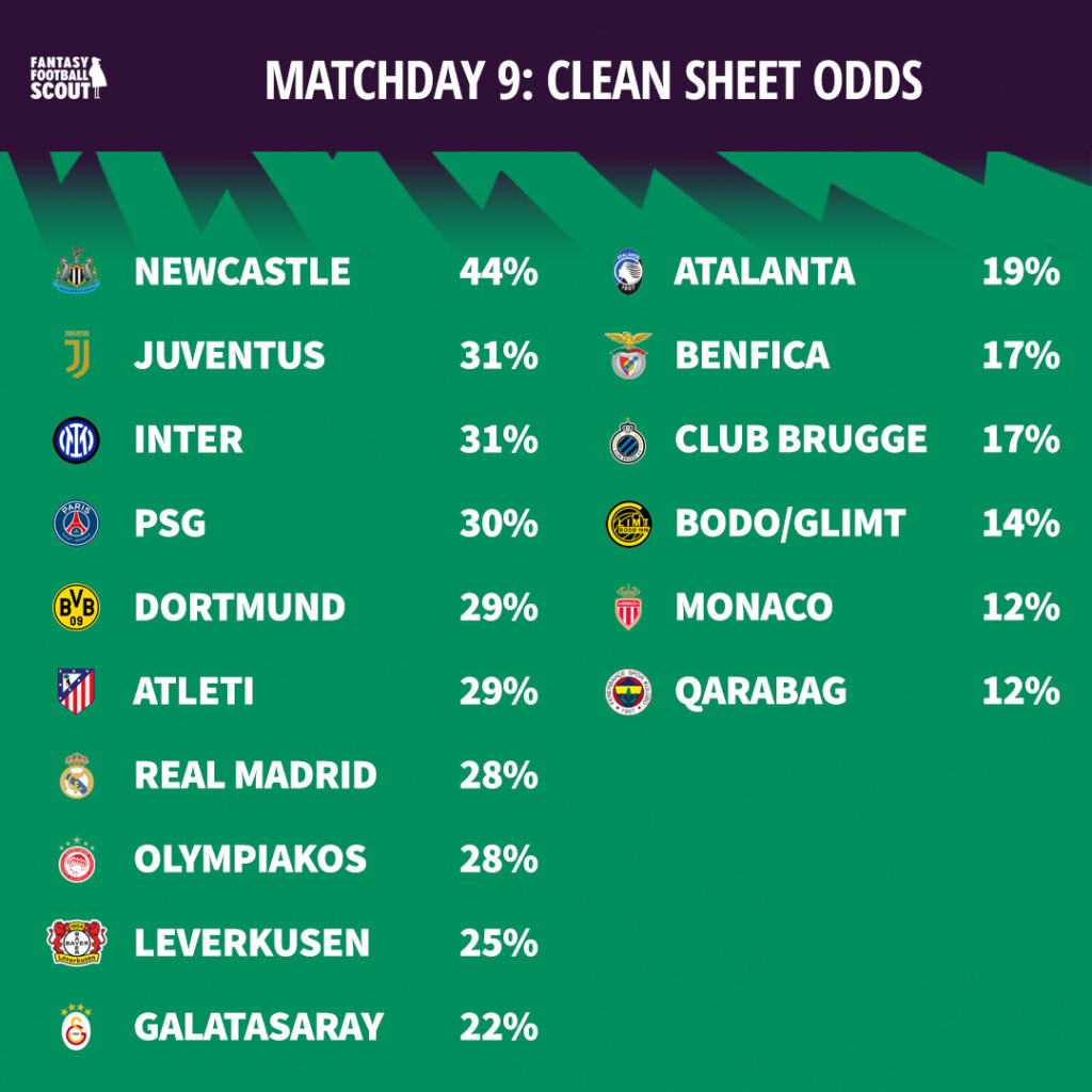 Rounding off the Matchday 9 top four is PSG. Their clean sheets haven’t exactly flowed in this competition – just two in eight matches – but a meeting with Monaco offers a good chance to steady things at the back.