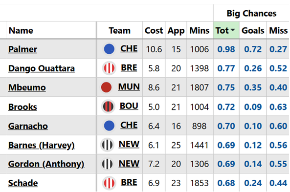 And of all the midfielders who’ve played at least 750 minutes so far, only Cole Palmer (£10.6m) has more big chances per 90 minutes (0.77):