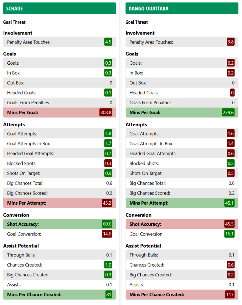 However, Ouattara likes to cross (58 v 14) and occasionally takes corners. When on the pitch, he’s involved in 48% of team goals, which is more than Schade’s 33%.