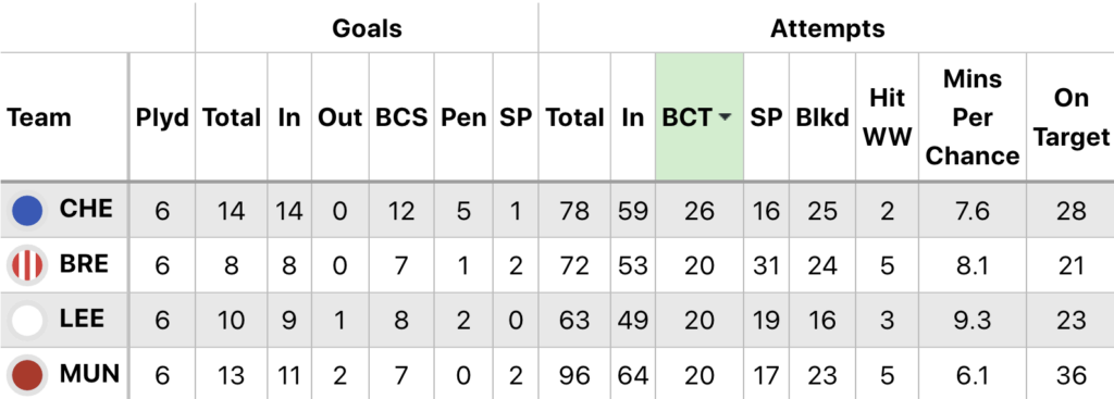 Chelsea are top for xG over the last six matches, with only a slight drop-off in actual goals scored.