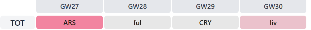 Oh, and suspended captain Cristian Romero (£5.0m) is missing another three league matches, while long-term absentees James Maddison (£6.8m) and Dejan Kulusevski (£6.4m) remain out.