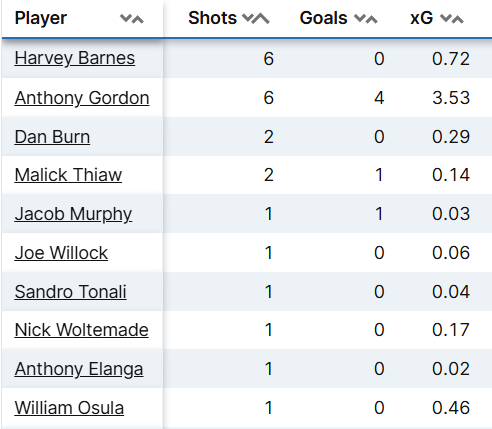 Gordon spurned two other huge chances on his way to a remarkable expected goals (xG) tally of 3.53 (Statsbomb, below):