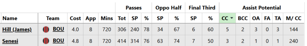 Things flip back in Hill’s favour when it comes to playmaking ability. He has created five chances (CC) to Senesi’s three, despite the pair being equal on two ‘big chances’ created (BCC). Hill’s superior pass completion rate – particularly in the final third – has helped him outperform his teammate in the bonus points system.
