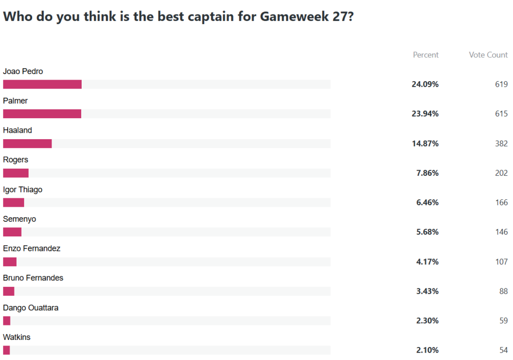 The aforementioned Chelsea duo, Palmer and Joao Pedro, are nigh-on inseparable at the top of the Fantasy Football Scout captaincy poll. In the last two Gameweeks, the pair have returned 50 Fantasy points between them.