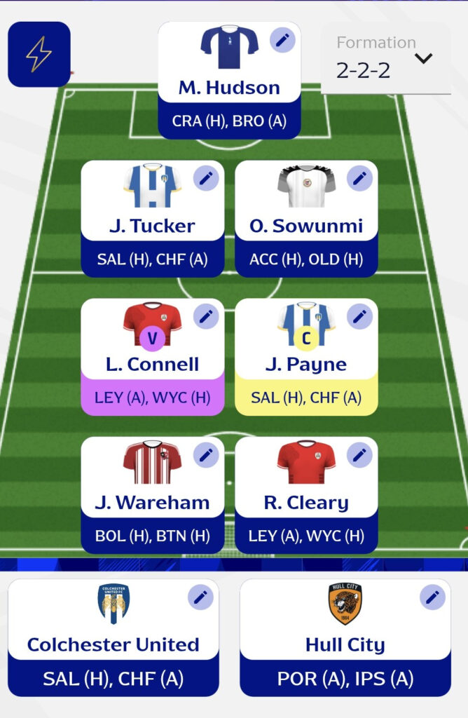- For team picks, I’ve gone with Colchester and Hull City. Colchester face Salford at home and Chesterfield away, and I believe they have enough quality to secure at least one win. Hull travel to Portsmouth and Ipswich, which are tough assignments, but their attack has shown it can trouble any side on its day.