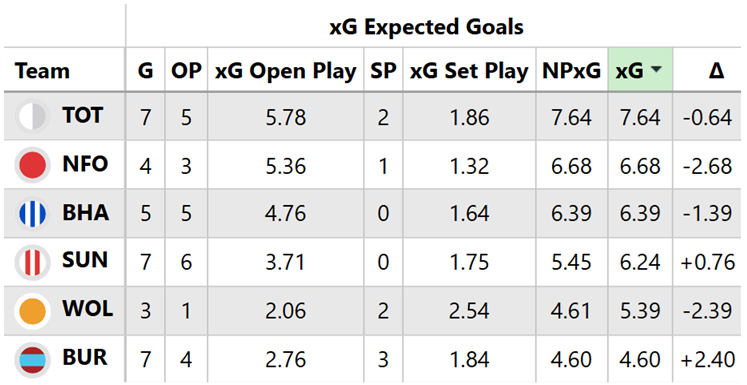 Above: The lowest non-penalty expected goals (NPxG) tallies over each team’s six matches