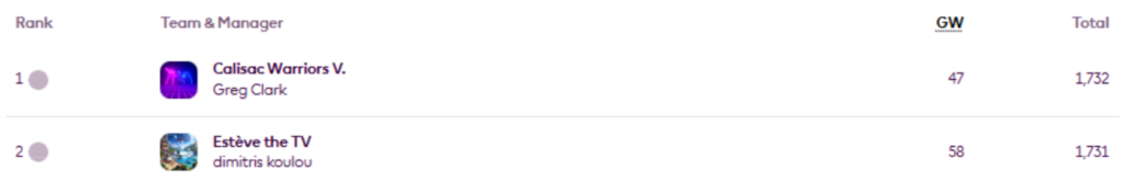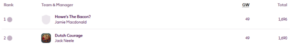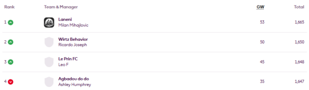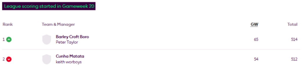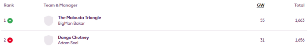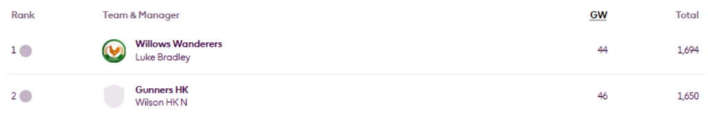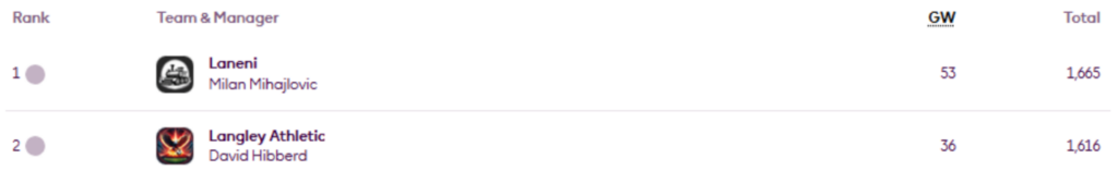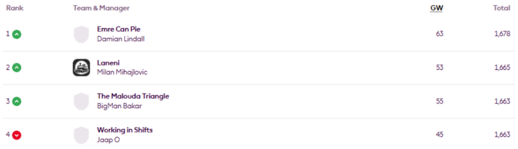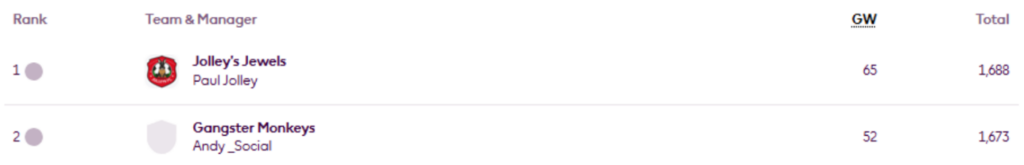 MIR’s FFS Head-to-Head Leagues were updated again on Thursday, now showing the positions after Gameweek 27.