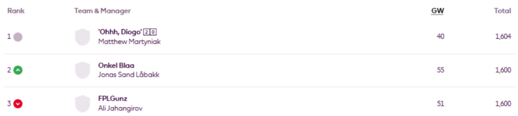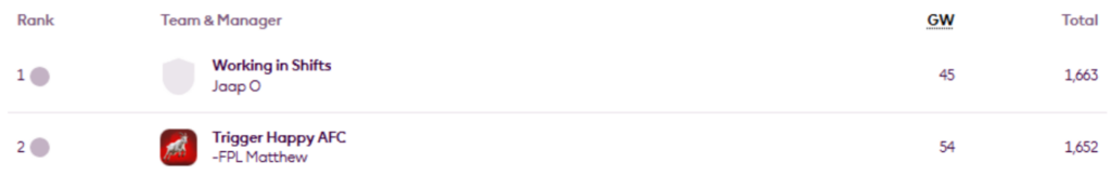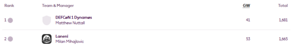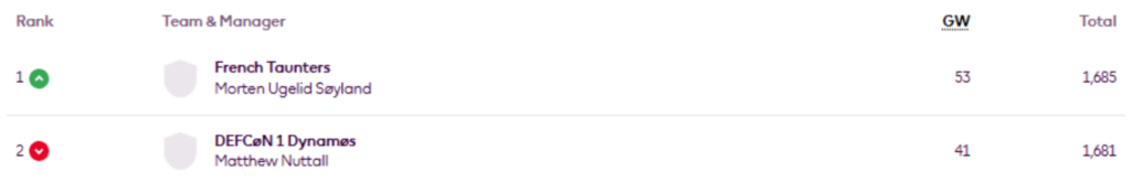 Morten Ugelid Søyland leads my Top 10k Any Season mini-league (code 6axmwm) again, having previously led after Gameweek 18. He is now 1,741st overall.