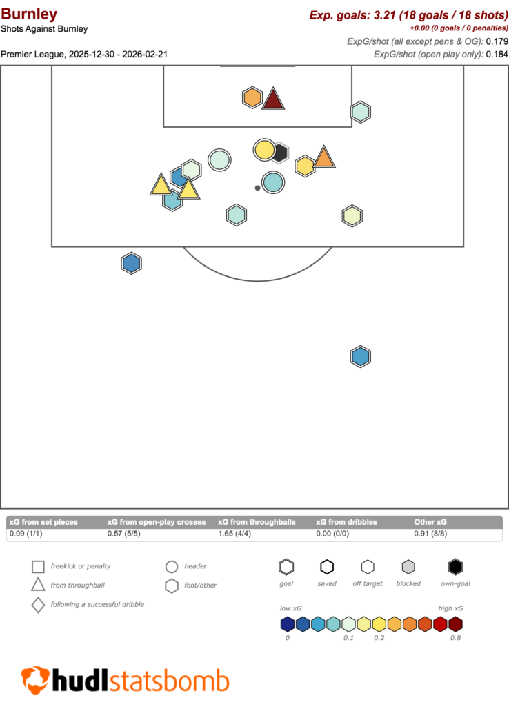 Above: Burnley’s goals conceded map in Gameweeks 19-27