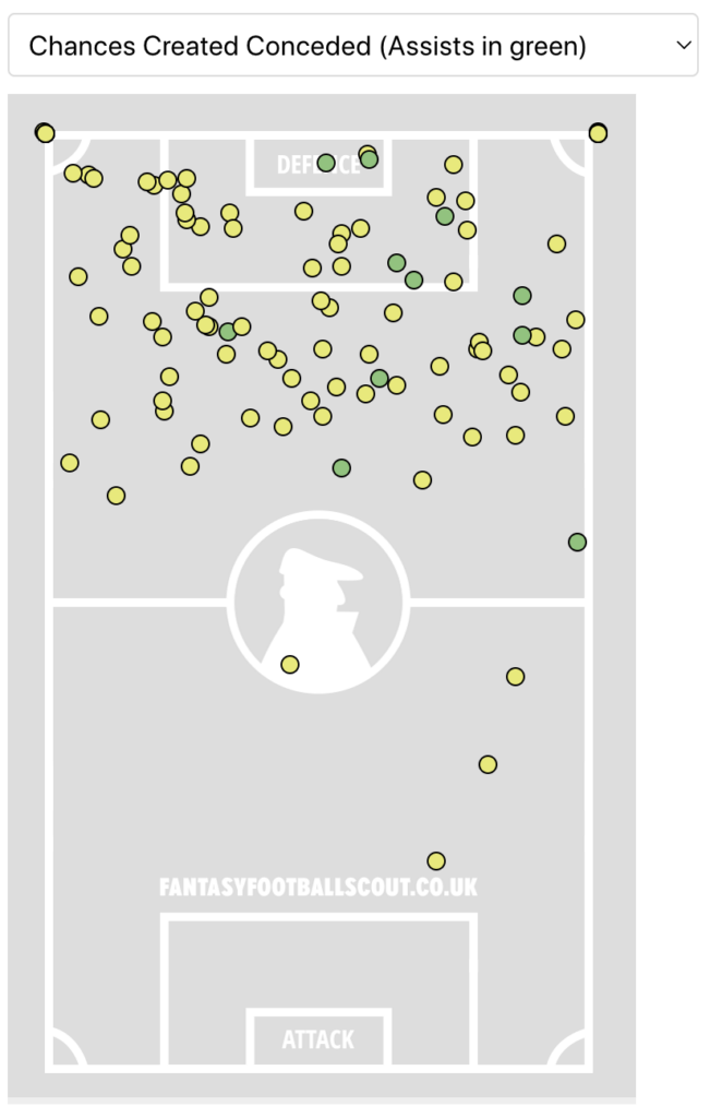 Above: Crystal Palace’s chances created conceded map (assists in green) in Gameweeks 14-27.